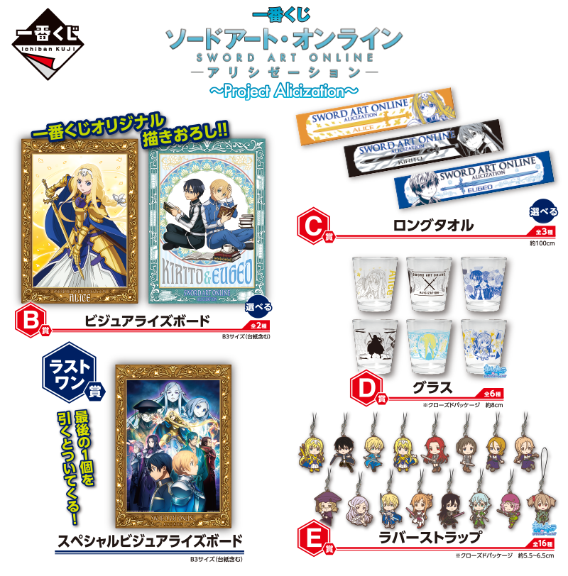 人気テレビアニメ「ソードアート・オンライン アリシゼーション」の一番くじが登場です。A賞アリスフィギュアに加えて描きおろしイラストが堪能できるビジュアライズボードや、ロングタオル、グラス、ラバーストラップがアソートされたバラエティ豊かなラインナップです。