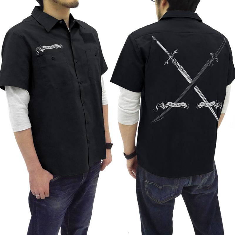背中にはアンティーク調にデザインされた、キリトの『夜空の剣』とユージオの『青薔薇の剣』をプリント。ユージオとの絆を背負った『黒の剣士キリト』モチーフのワークシャツ。二人の絆を体感しよう!本商品は数量限定品です。