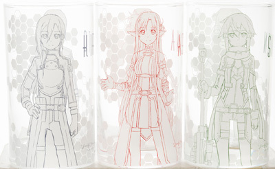 主人公「キリト」、ヒロイン「シノン」、「アスナ」をデザインしたグラスタンブラー(3 種類の中から1 つ)